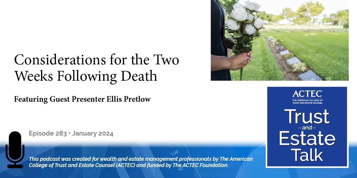 This is Doug Stanley, ACTEC Fellow from St. Louis, Missouri. This podcast will continue a discussion on considerations when receiving the news that a client has passed away (Deathbed Planning for the Two Weeks Prior to Death). In the immediate aftermath of a client’s passing, the focus shifts from planning to execution, involving a plethora of issues that emerge within the post-death administration process. Guest Ellis Pretlow of Norfolk, Virginia, will offer recommendations for professionals during this critical time frame. Welcome Ellis.
